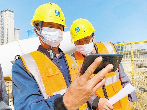 10月16日,中建三局的建设者在项目工地上用手机收看党的二十大开幕会盛况。(湖北日报全媒记者 柯皓 通讯员 谢杰夫 朱桢源 摄)