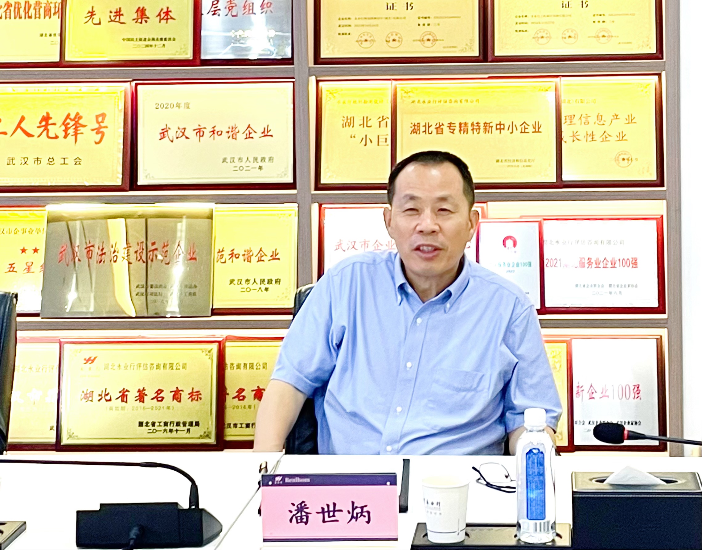 潘世炳对潘家华教授的到来表示热烈欢迎,介绍了公司的发展历程、资质荣誉、业务布局、创新研发等方面的情况。他表示,公司始终以国家战略为导向,在资源环境优化、生态环保治理、绿色金融创新、零碳园区建设等领域深耕细作,通过技术创新与模式探索,为政府部门和企业提供高质量服务,为推动绿色转型、服务支点建设、共建美丽湖北贡献永业行的智慧与力量。